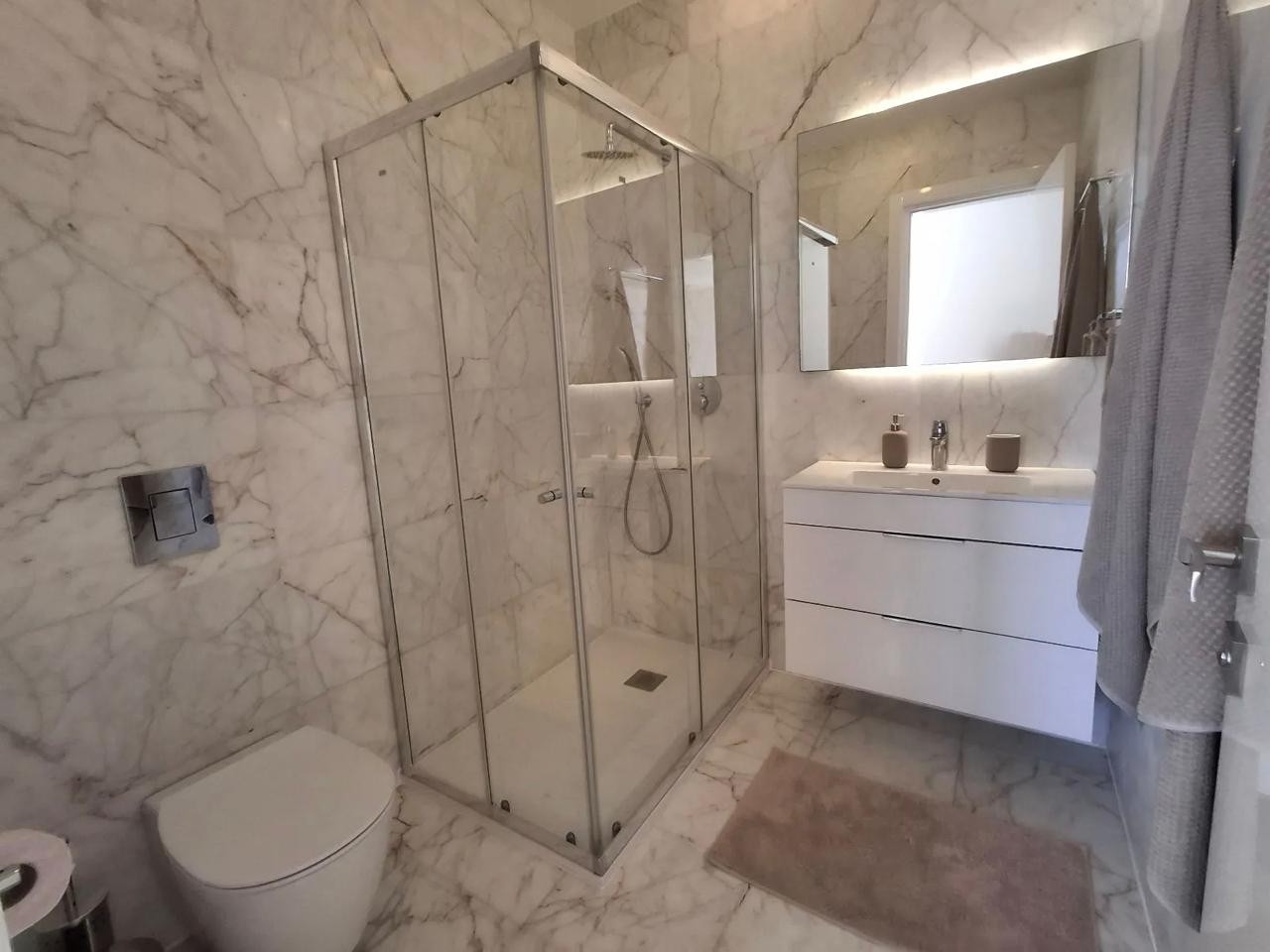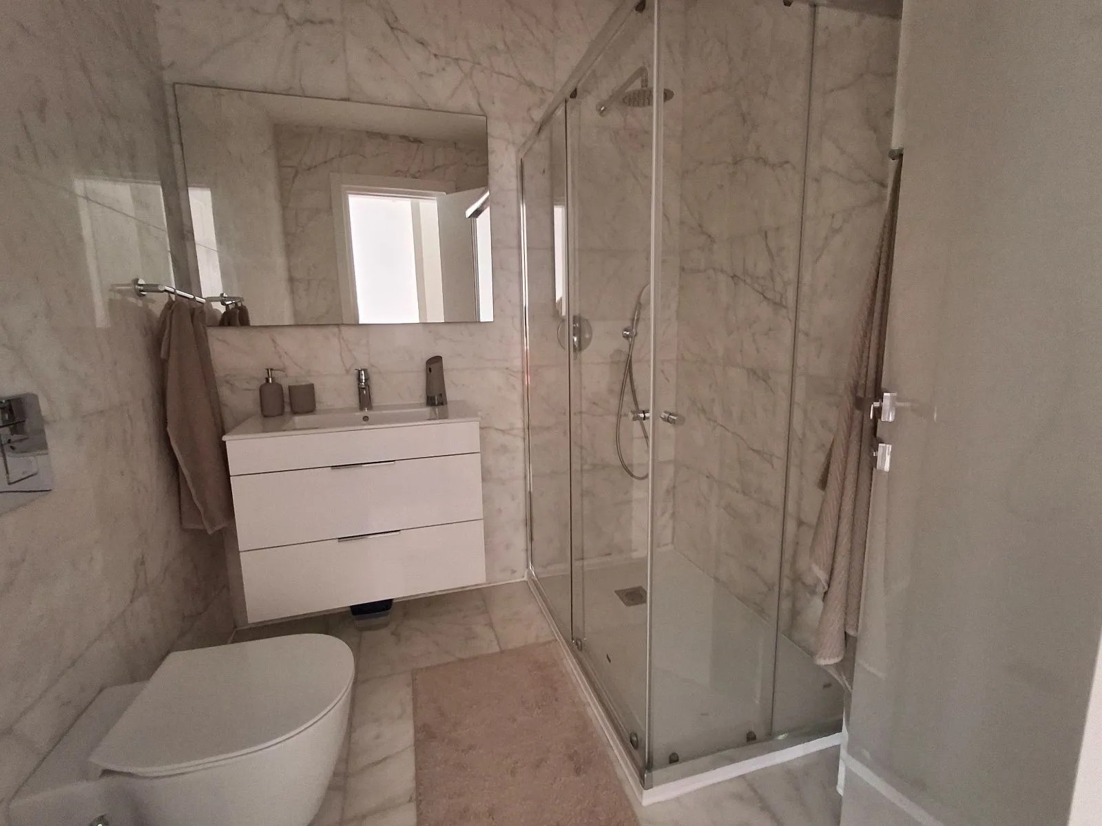 The apartment includes 3 bedrooms and 2 bathrooms, both fitted with showers. One bathroom is shared, while the second is ensuite to the master bedroom. The living areas feature matte marble flooring, while parquet flooring is used in the bedrooms.