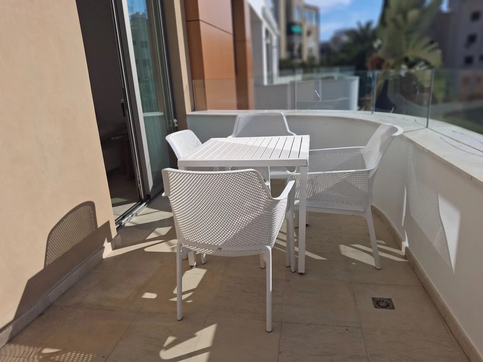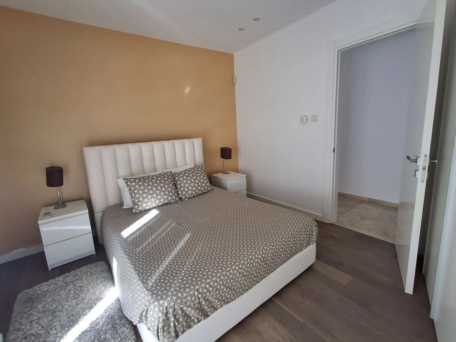 The property offers a well designed open plan layout. Upon entering, there is a spacious living, dining and kitchen area that opens onto a south facing terrace. The terrace enjoys partial sea views as well as views over the communal swimming pool. On the west side of the living area there is one bedroom, while a small corridor on the east side leads to the shared bathroom with shower, the second bedroom and the master bedroom. All bedrooms are south facing, ensuring good natural light throughout the day.