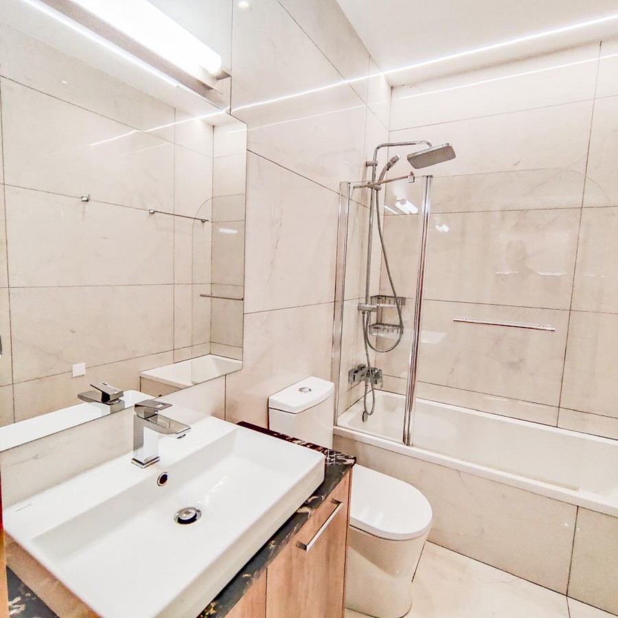 The bedroom is spacious and well arranged, while the bathroom is fitted with contemporary fixtures and marble effect finishes.