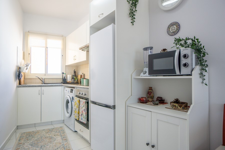 The apartment features a bright open-plan kitchen and living area that creates a comfortable and practical living space. The property comes fully furnished and is equipped with air conditioning, fly screens, and shutters, ensuring comfort throughout the year. A private storage room adds extra convenience, while the building is serviced by an elevator for easy access.