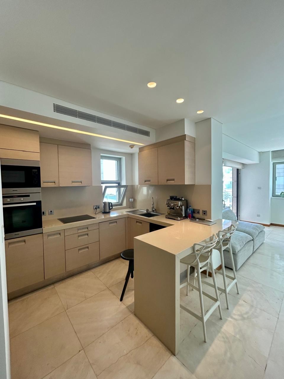 The apartment features a well-proportioned open-plan living and dining area with a modern, fully fitted kitchen, designed to maximise natural light and sea views. A discreet, integrated climate control system provides year-round comfort.