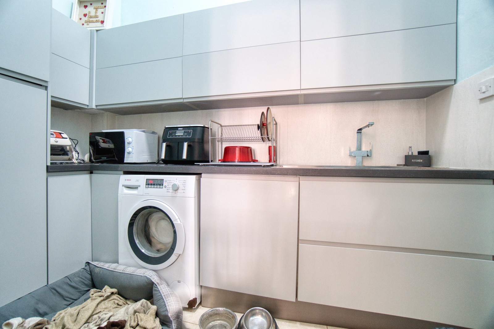 The main kitchen worktops are of acrylic composite granite design with the Island also housing the dishwasher. There is a ceramic hob and 'Cube" extractor system. To the rear of the kitchen is a utility room again redesigned to a high level, suspended ceiling and black granite worktops. A door leads to the single garage with remotely operated electric door.