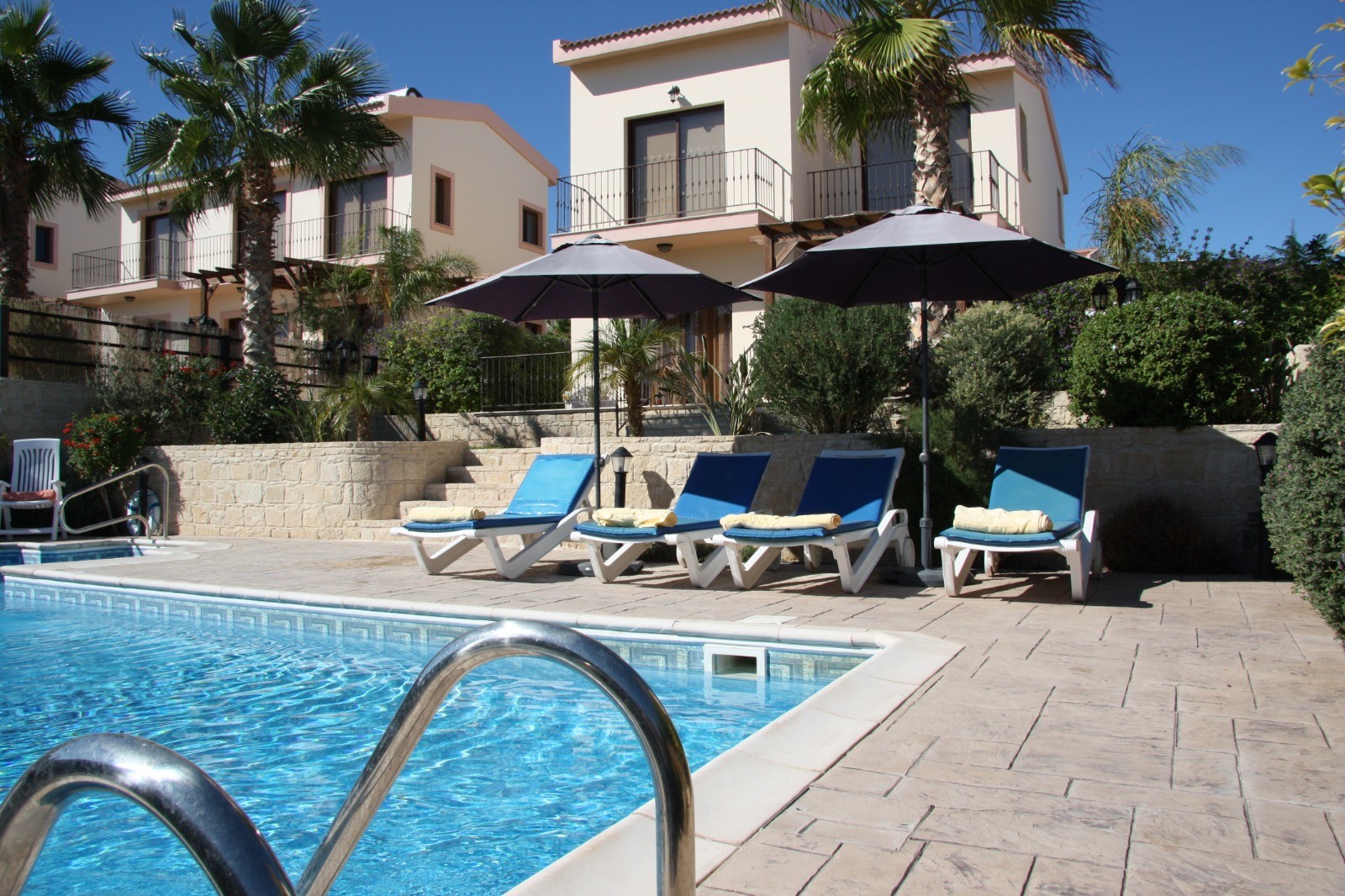 The house comprises three spacious bedrooms. The master bedroom includes a king size bed and an en suite shower room, while the other two bedrooms are fitted with twin beds. In addition, there is a main bathroom and a guest WC on the ground floor.
