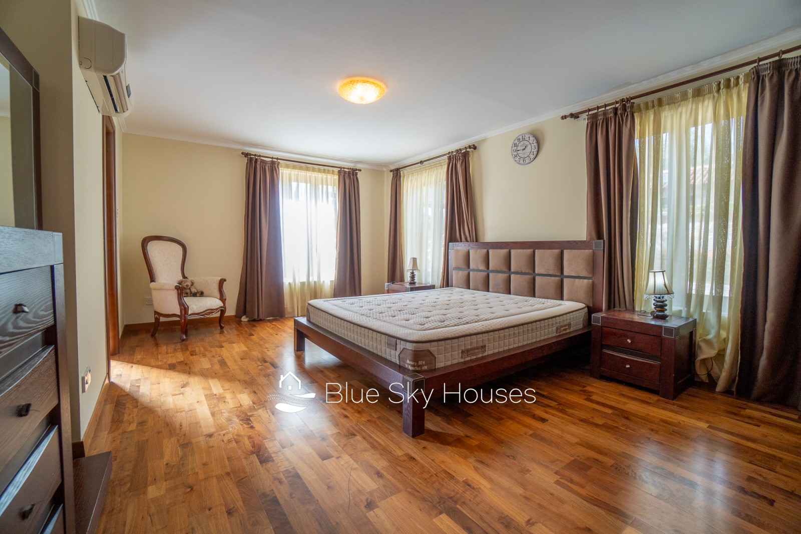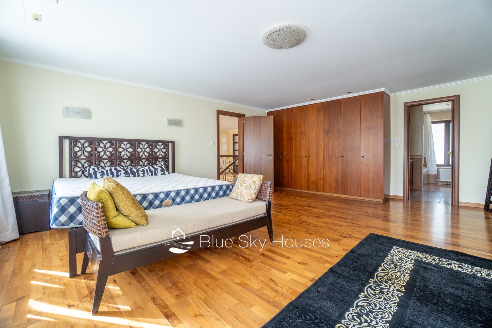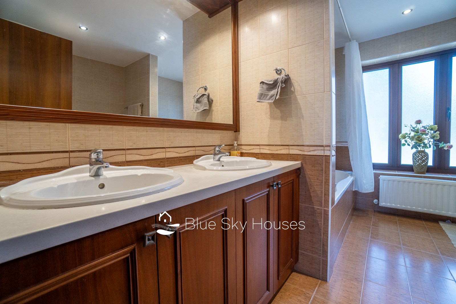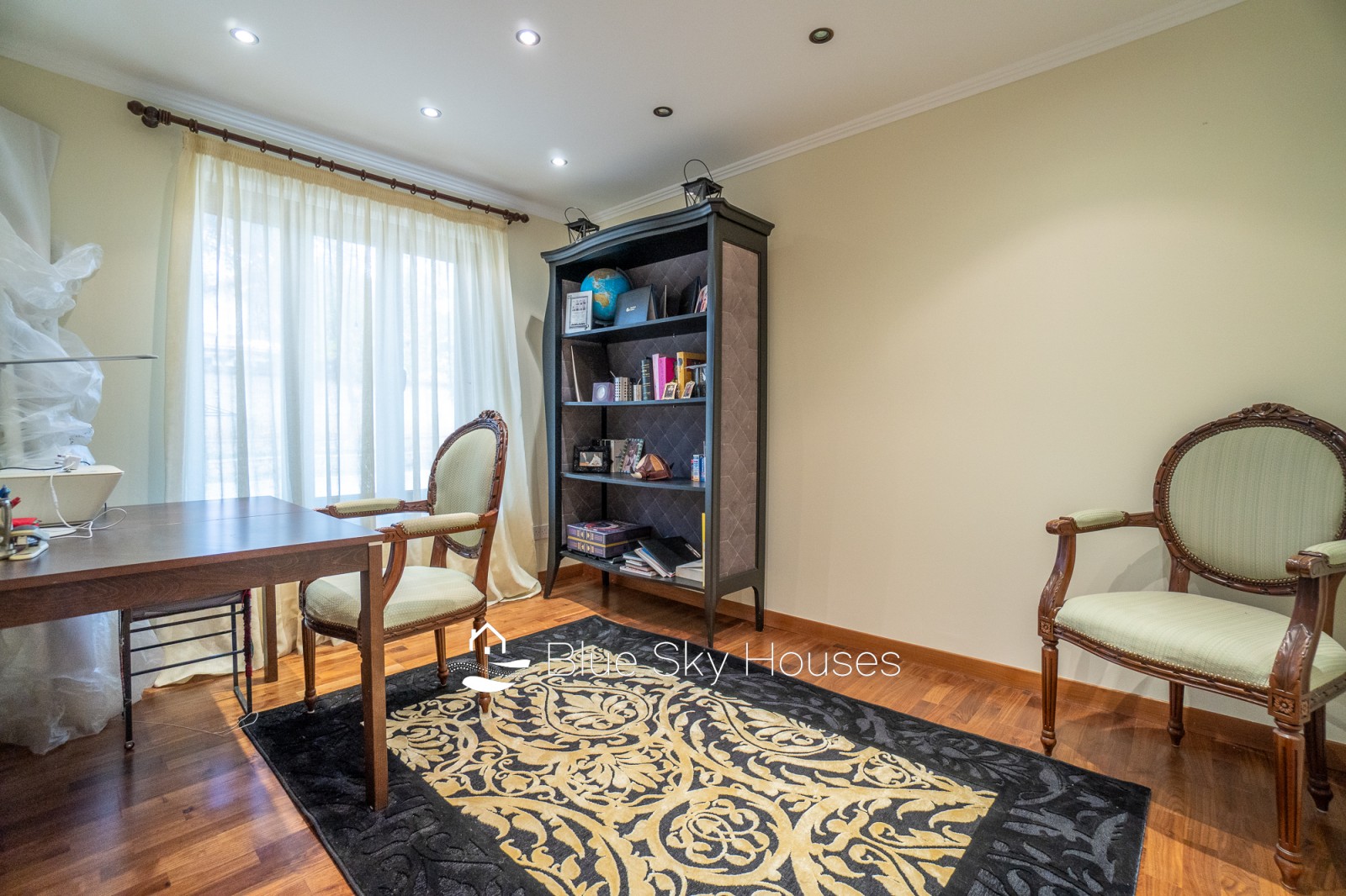The house offers a generous covered area of 330sqm and is fully furnished. On the ground floor at pool level, there is a spacious living room with a dining area, a separate kitchen, laundry room, guest WC, a large bedroom with an ensuite bathroom and a storage room. A wide and elegant staircase leads to the first floor, where there is a very large master bedroom with an ensuite bathroom featuring both a separate shower and a bathtub. This level also includes an office room and two additional spacious bedrooms, both with ensuite bathrooms.