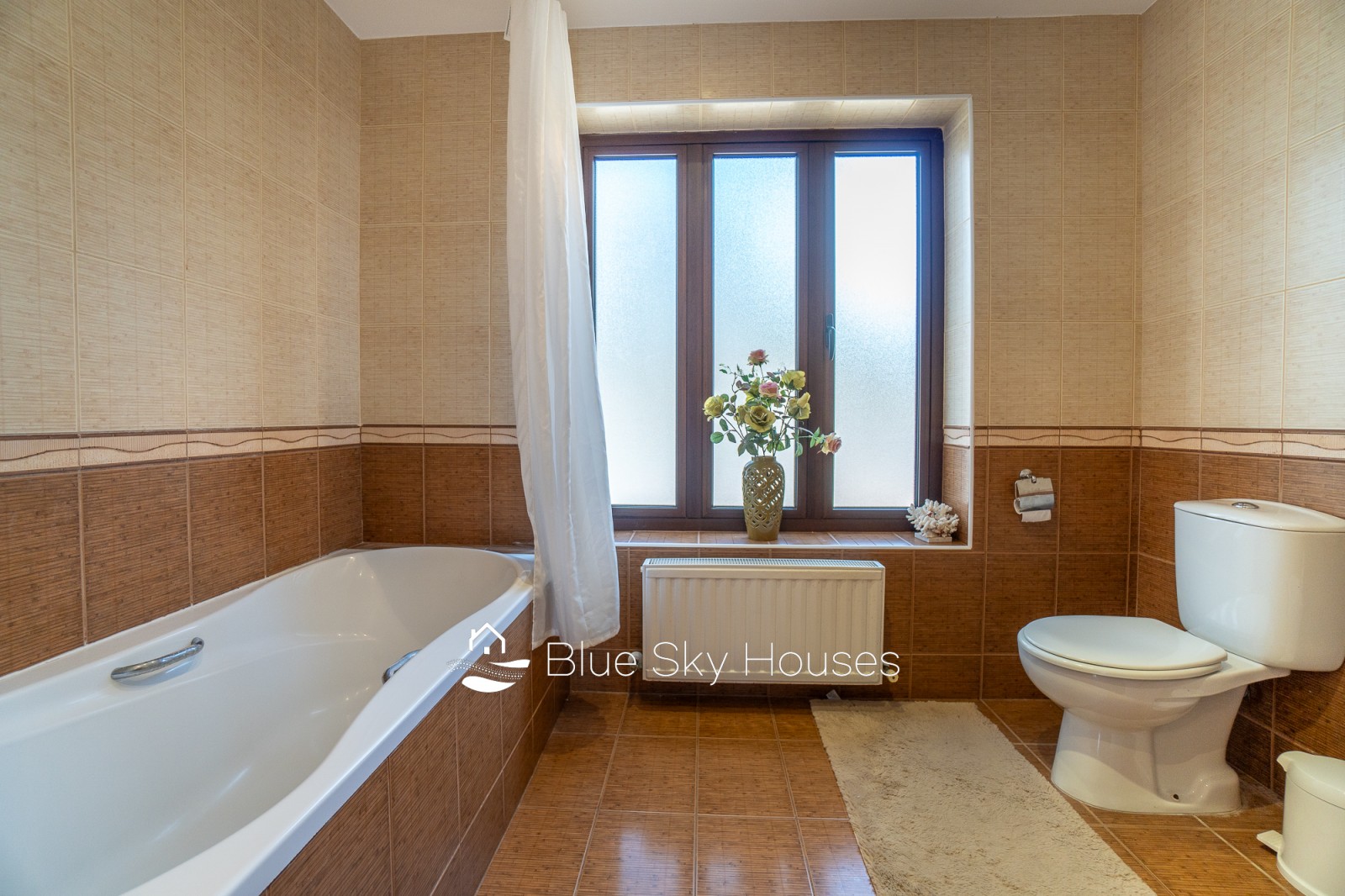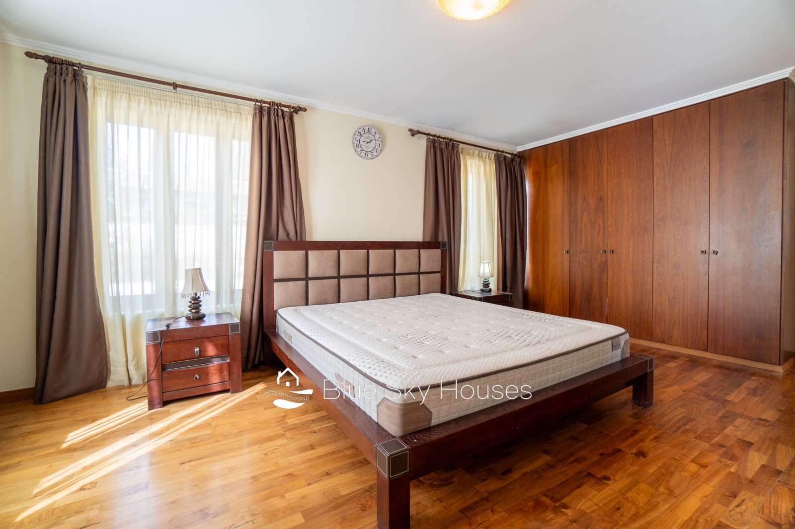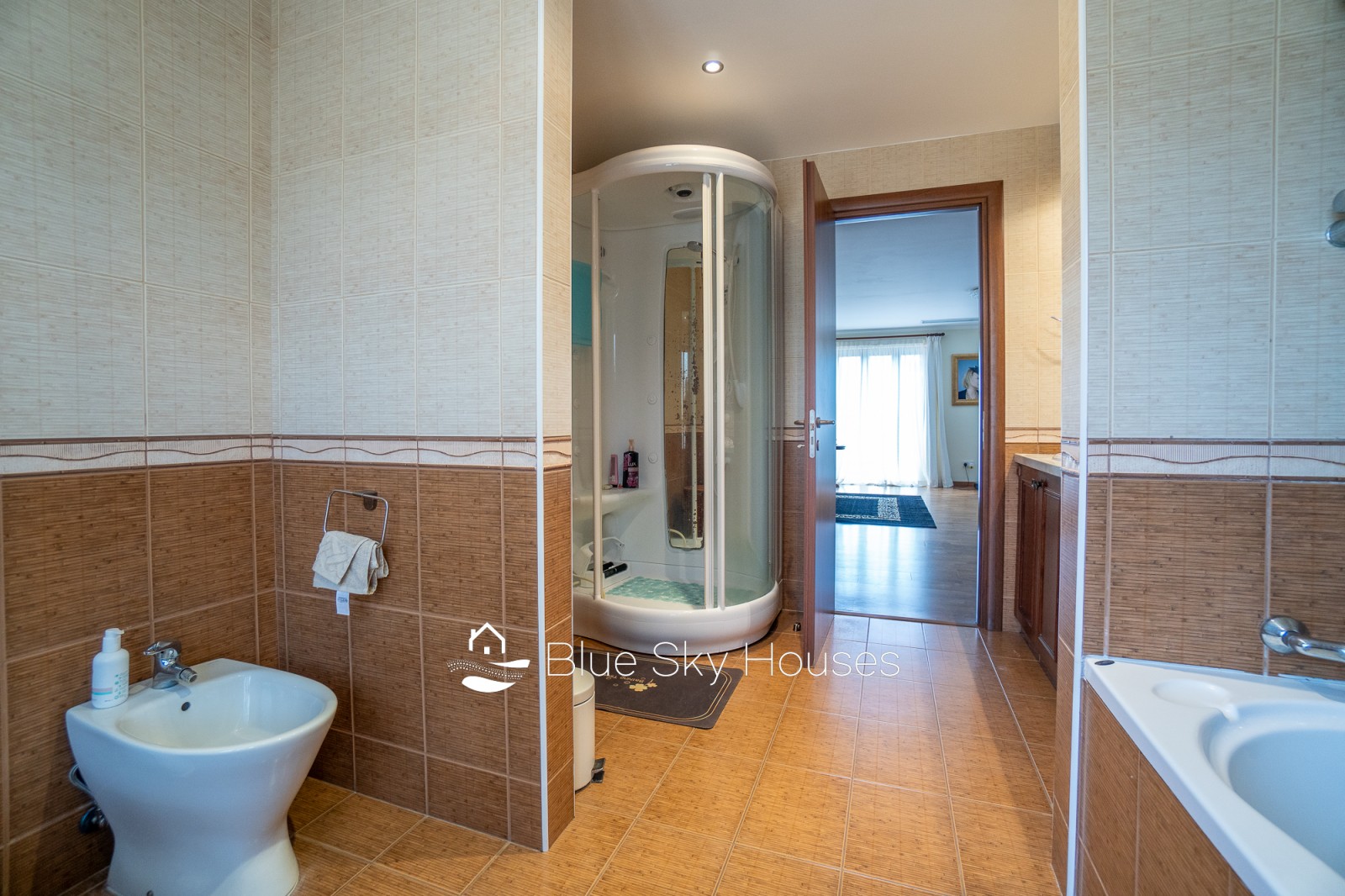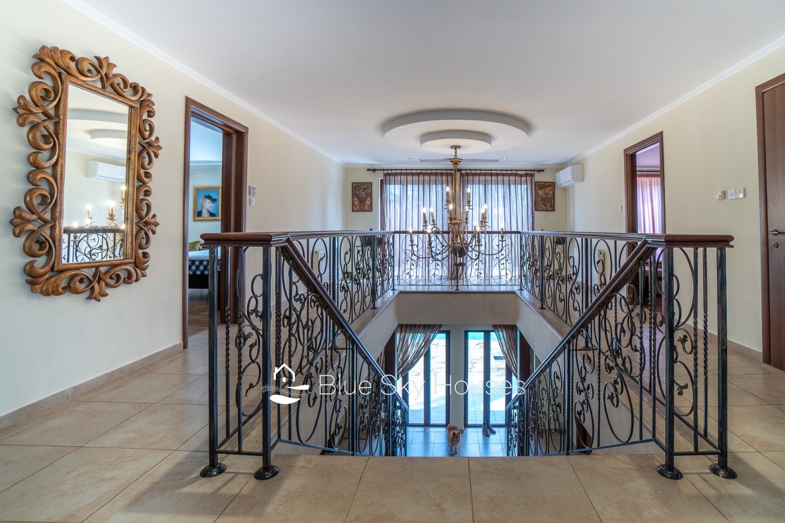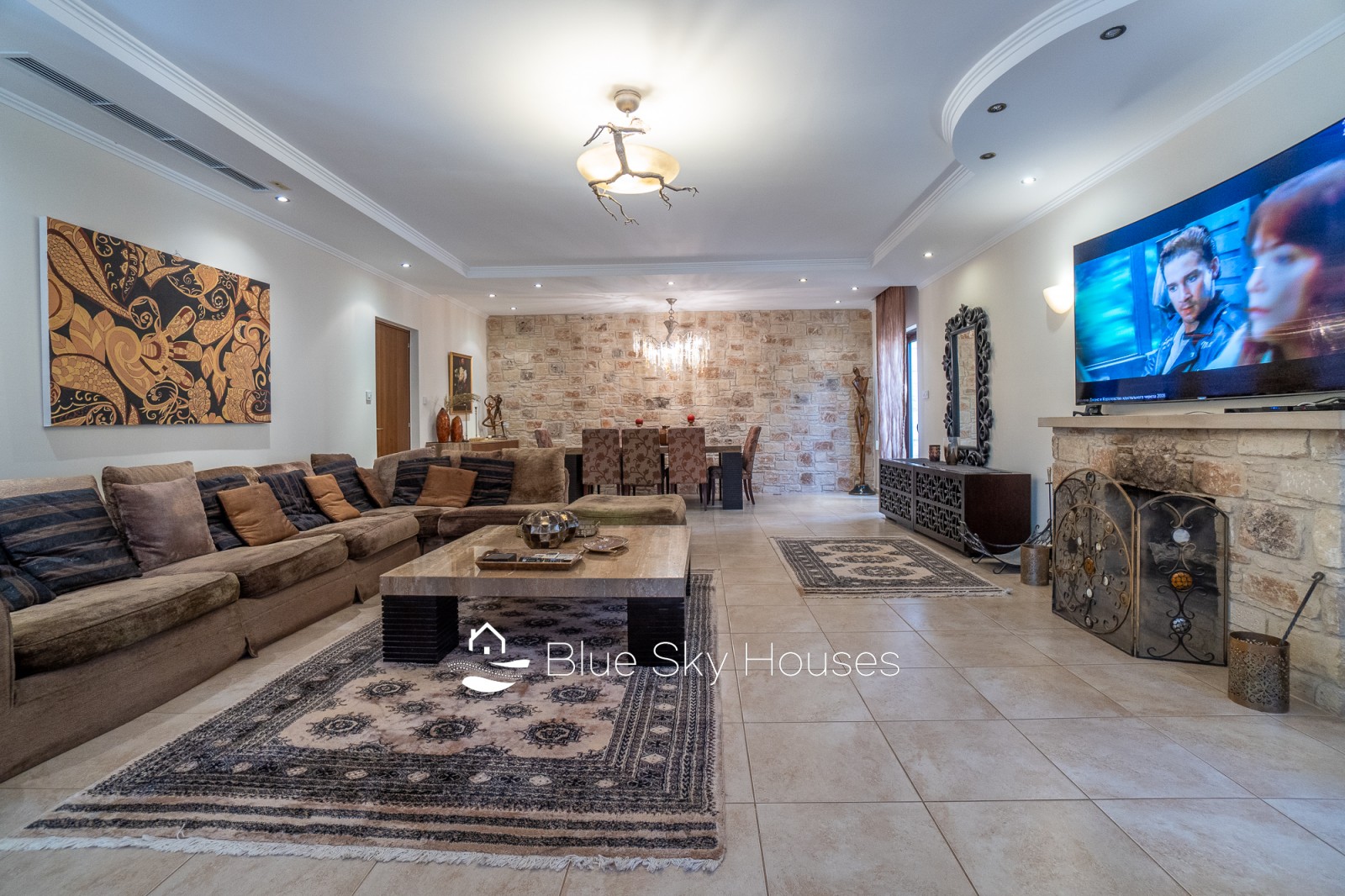 The house offers a generous covered area of 330sqm and is fully furnished. On the ground floor at pool level, there is a spacious living room with a dining area, a separate kitchen, laundry room, guest WC, a large bedroom with an ensuite bathroom and a storage room. A wide and elegant staircase leads to the first floor, where there is a very large master bedroom with an ensuite bathroom featuring both a separate shower and a bathtub. This level also includes an office room and two additional spacious bedrooms, both with ensuite bathrooms.