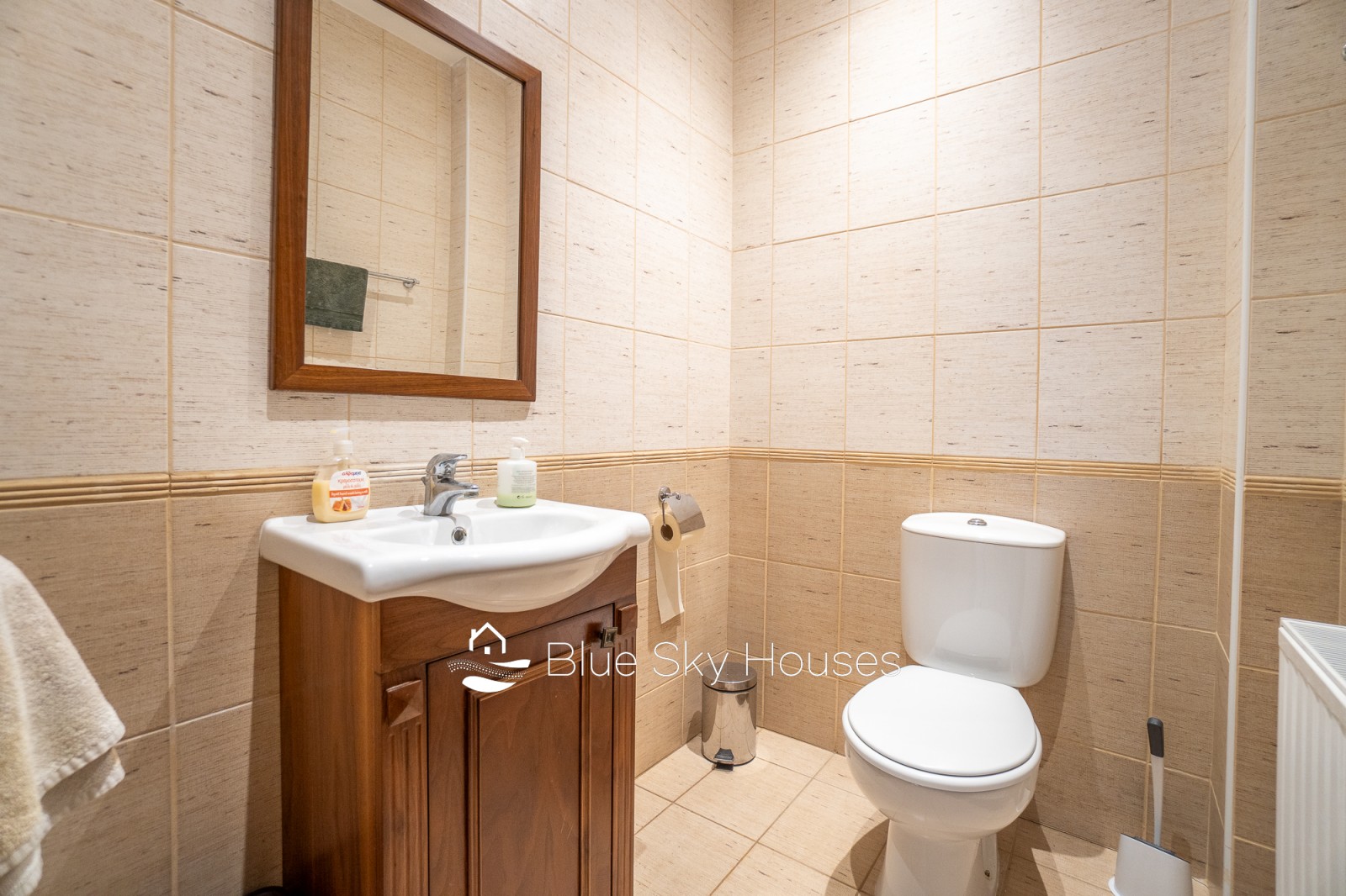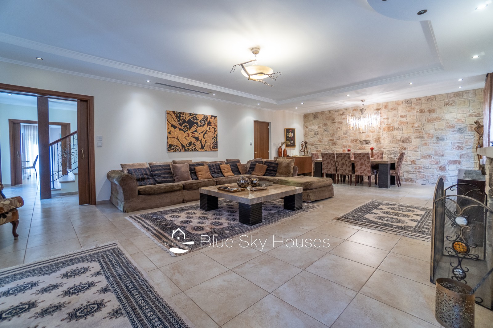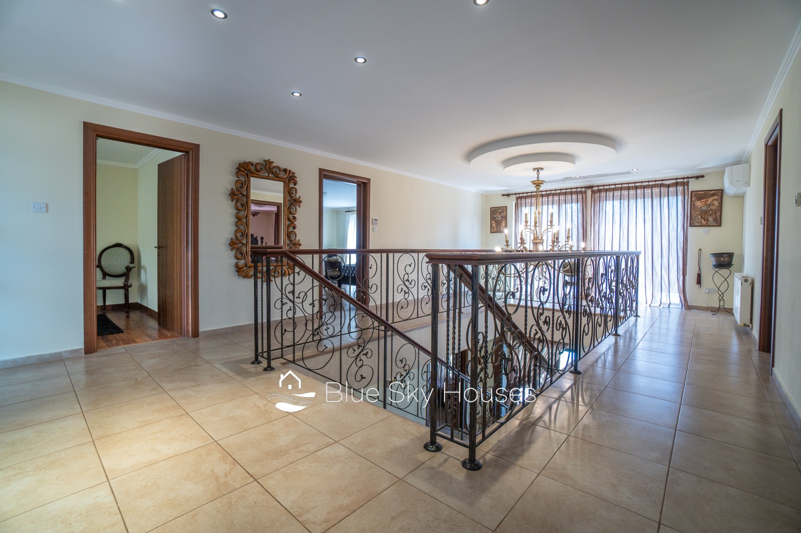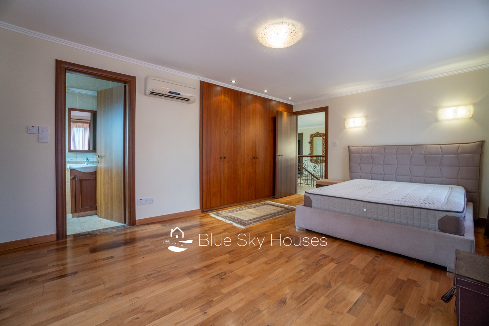 The house offers a generous covered area of 330sqm and is fully furnished. On the ground floor at pool level, there is a spacious living room with a dining area, a separate kitchen, laundry room, guest WC, a large bedroom with an ensuite bathroom and a storage room. A wide and elegant staircase leads to the first floor, where there is a very large master bedroom with an ensuite bathroom featuring both a separate shower and a bathtub. This level also includes an office room and two additional spacious bedrooms, both with ensuite bathrooms.
