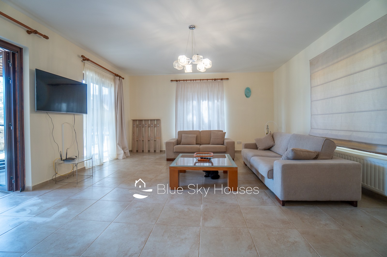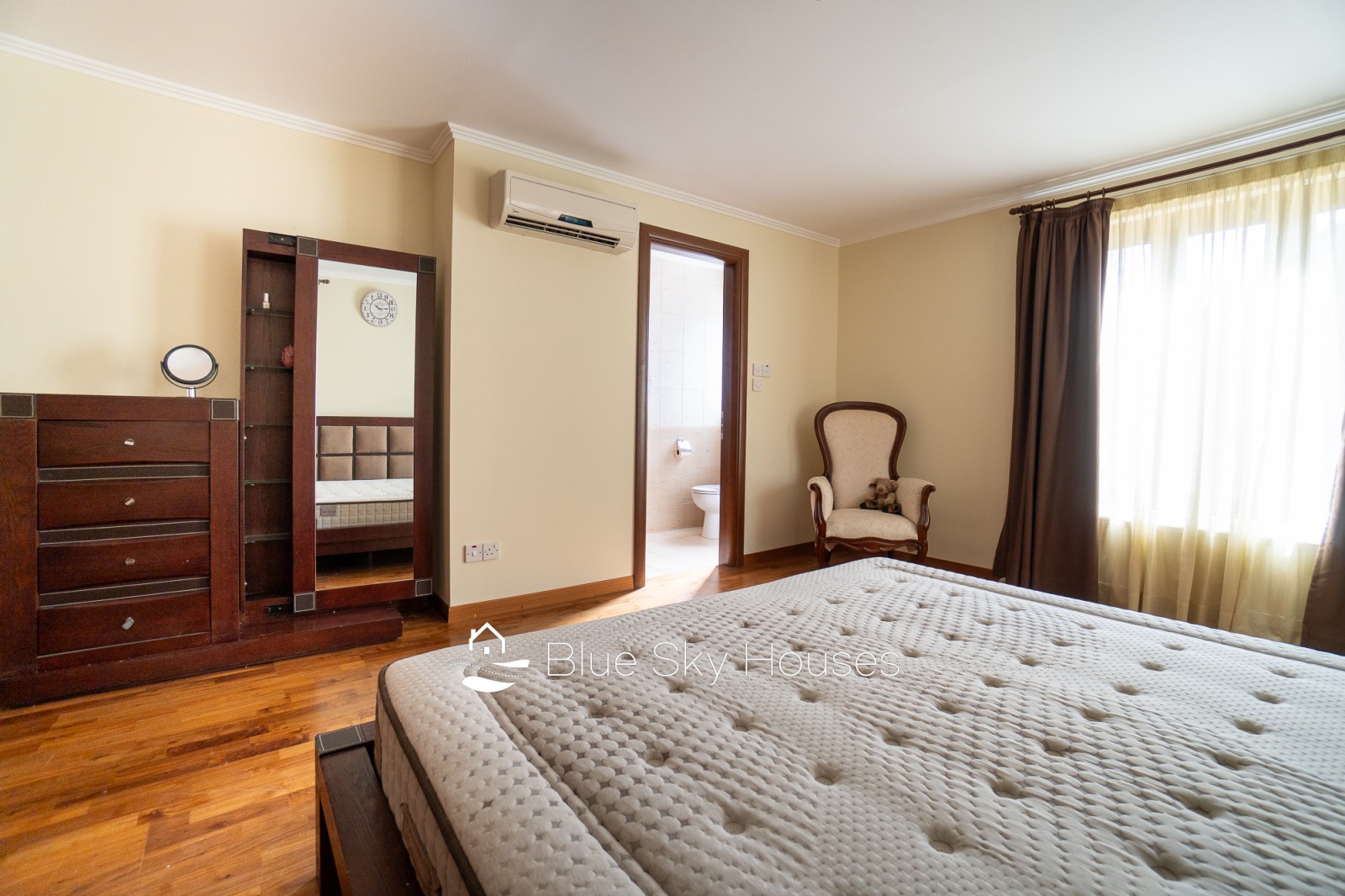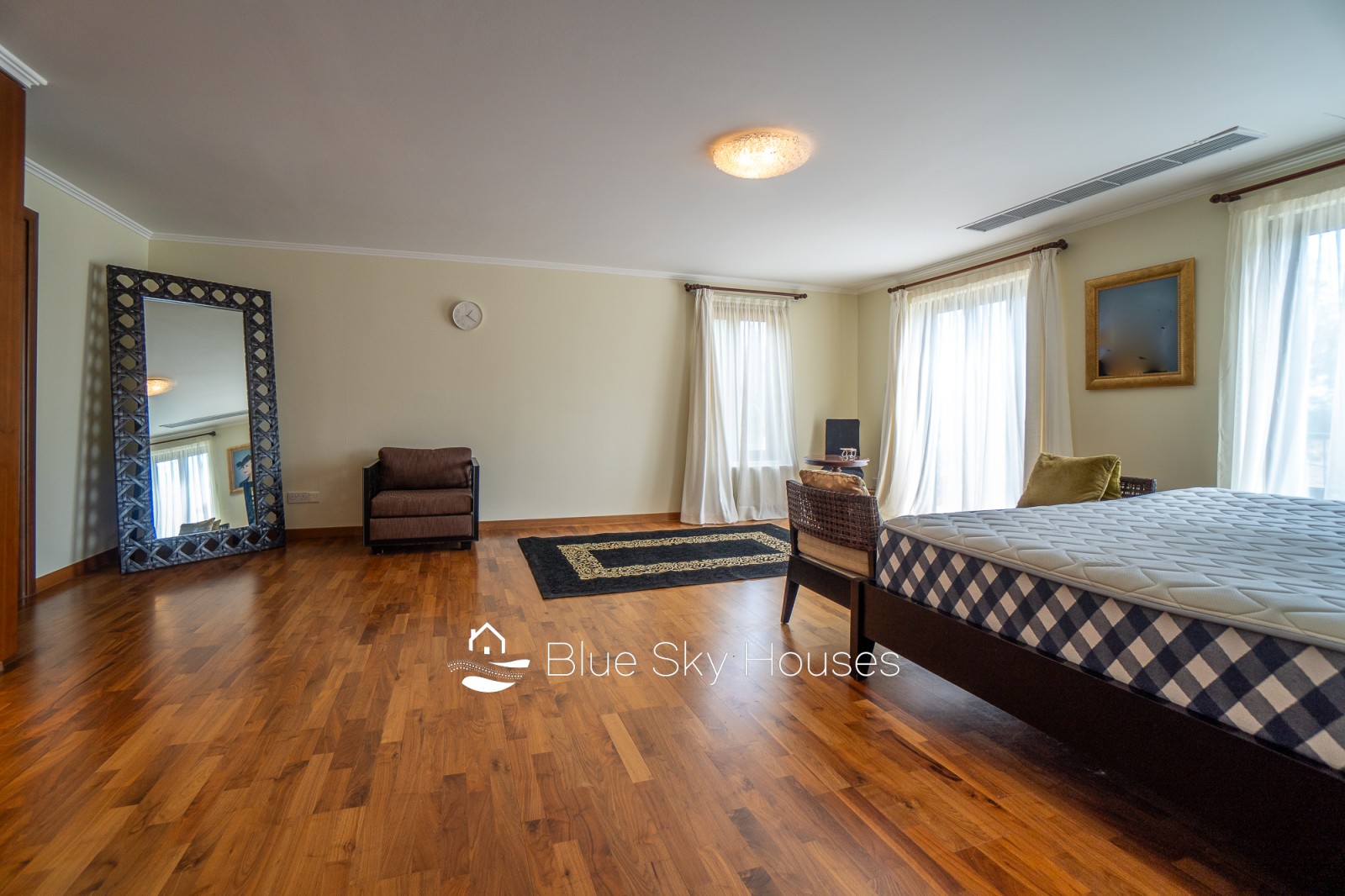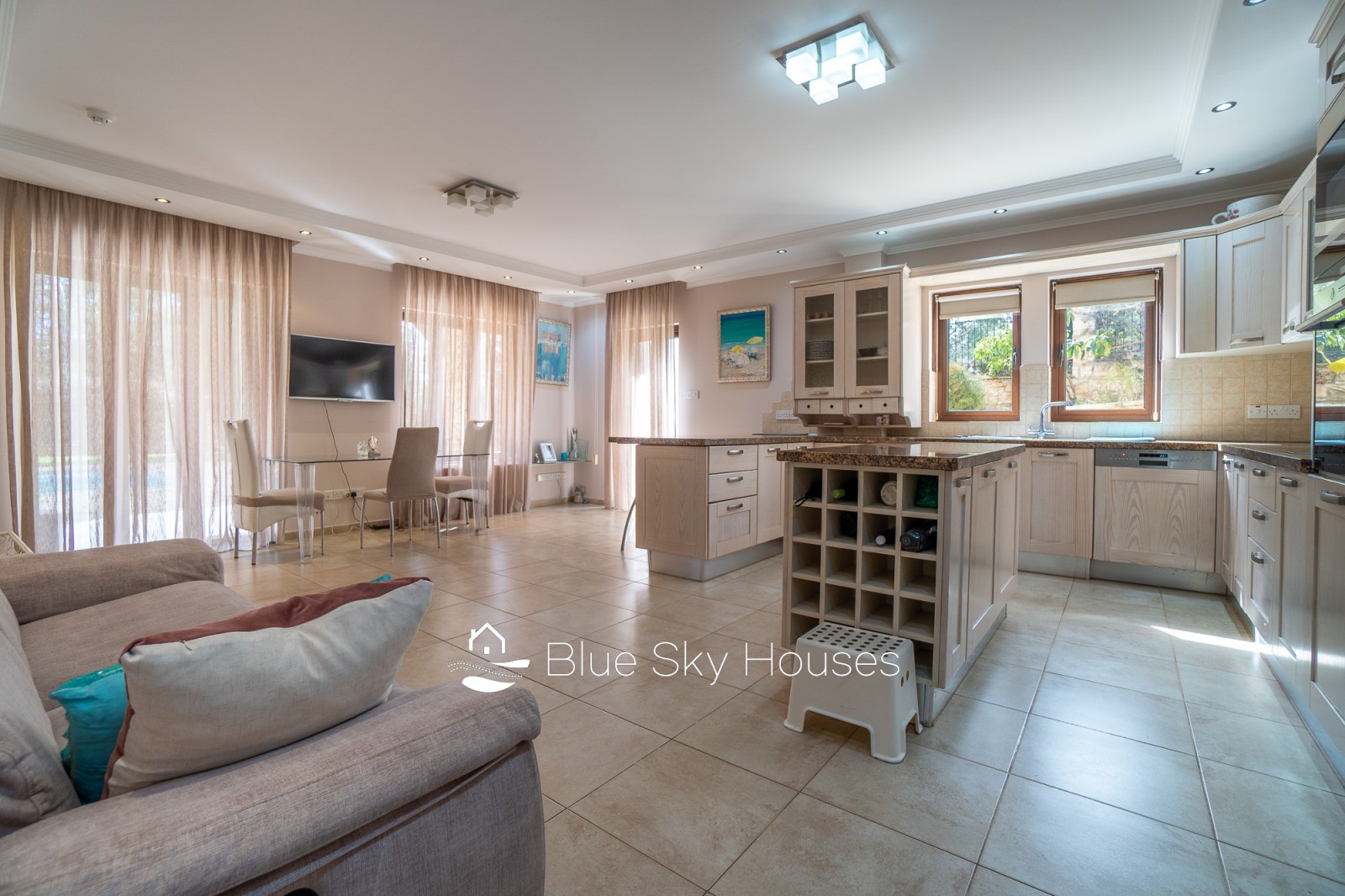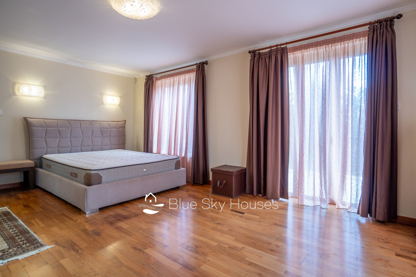 The house offers a generous covered area of 330sqm and is fully furnished. On the ground floor at pool level, there is a spacious living room with a dining area, a separate kitchen, laundry room, guest WC, a large bedroom with an ensuite bathroom and a storage room. A wide and elegant staircase leads to the first floor, where there is a very large master bedroom with an ensuite bathroom featuring both a separate shower and a bathtub. This level also includes an office room and two additional spacious bedrooms, both with ensuite bathrooms.