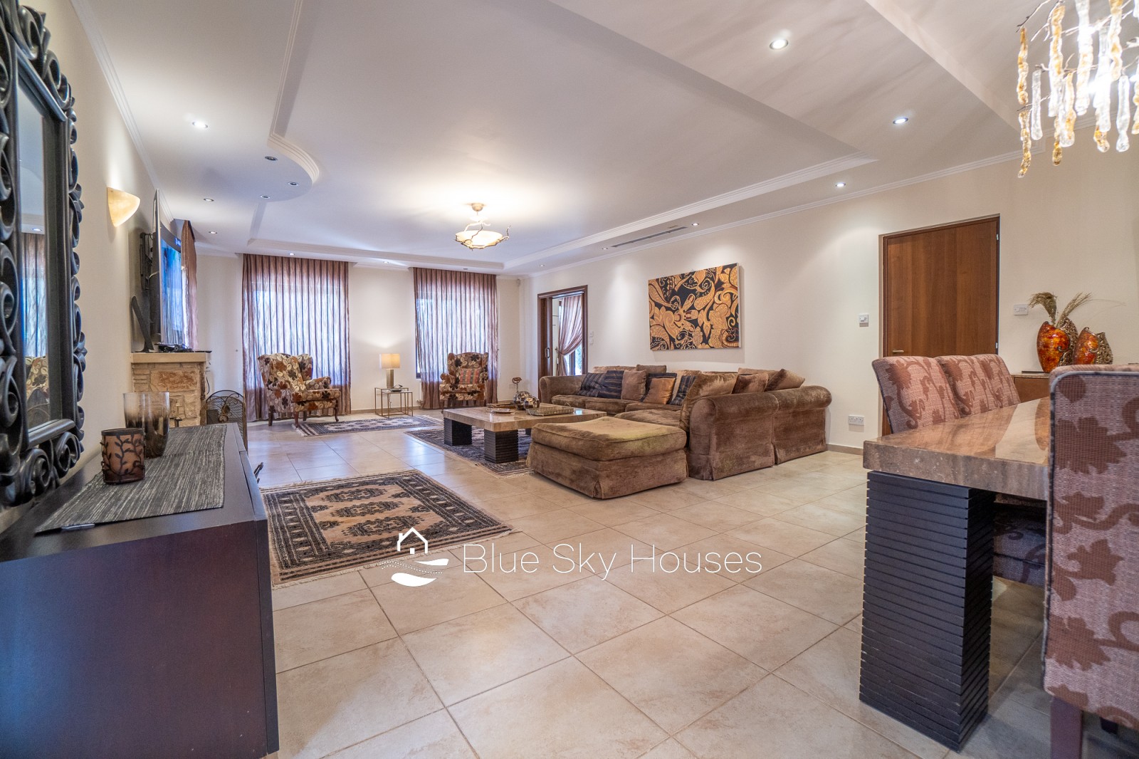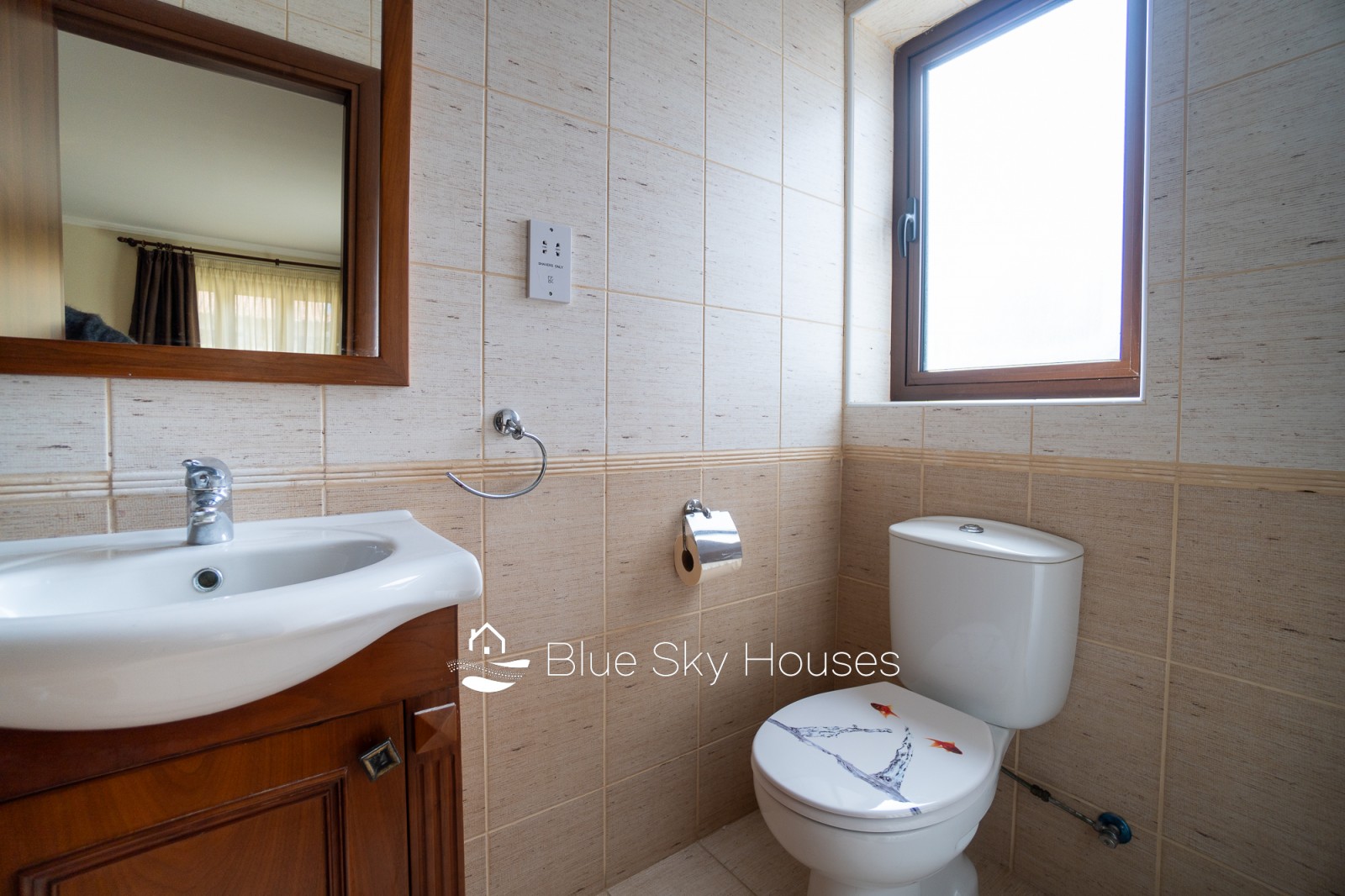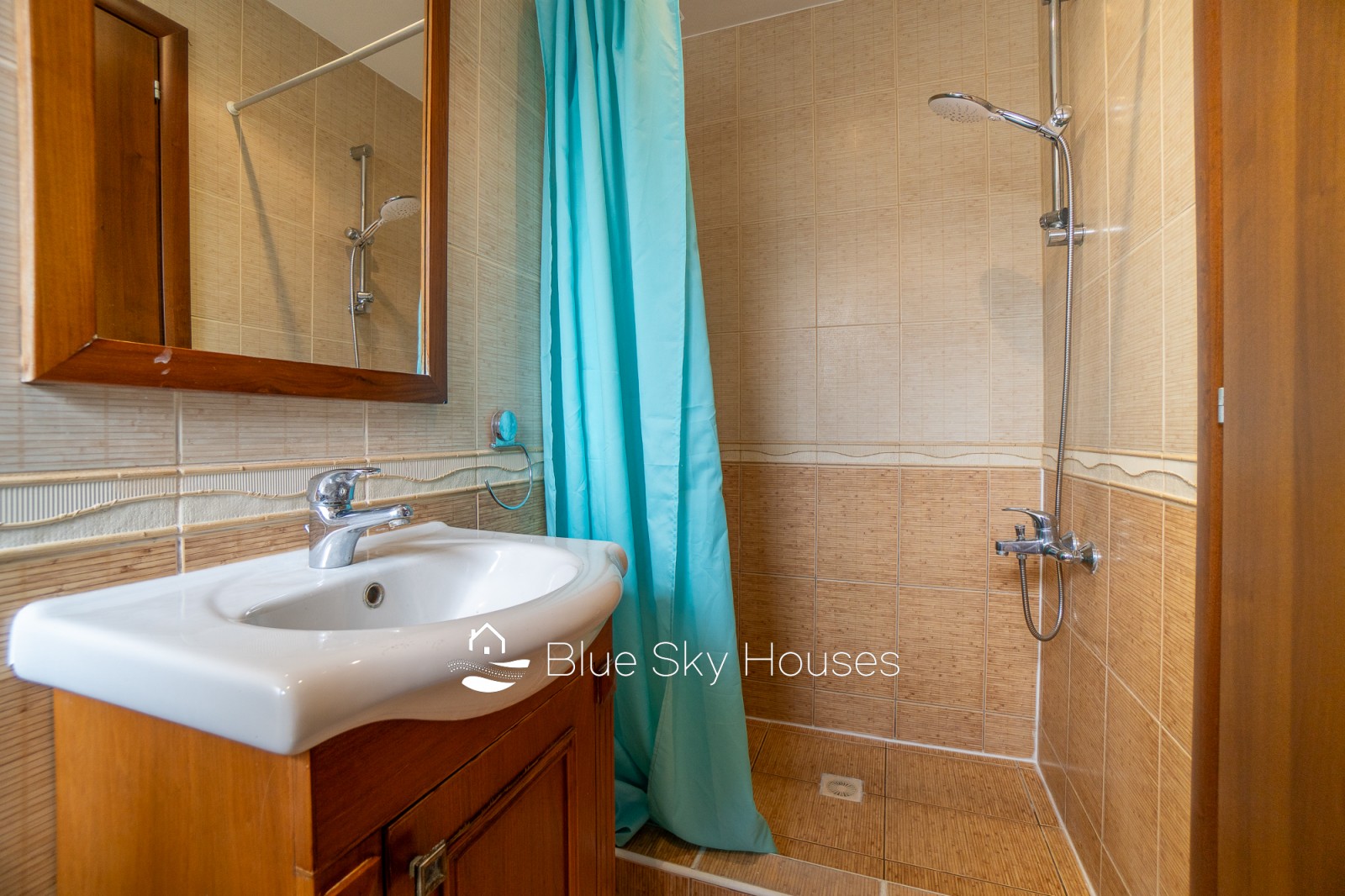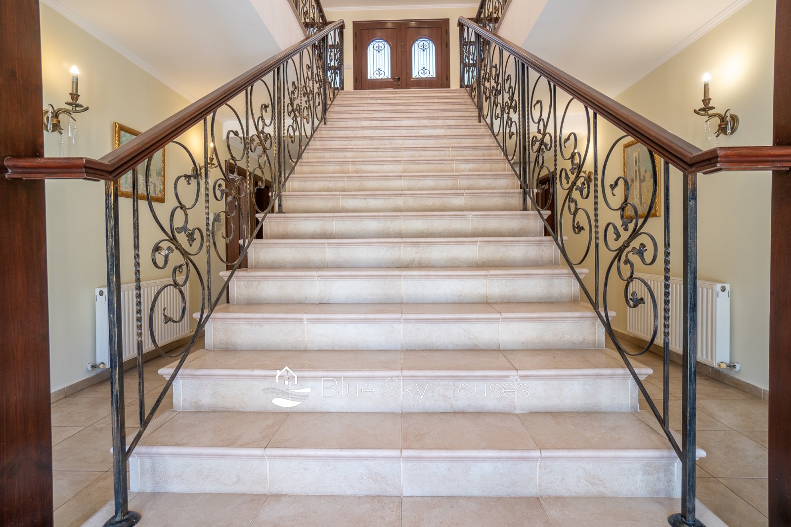 The house offers a generous covered area of 330sqm and is fully furnished. On the ground floor at pool level, there is a spacious living room with a dining area, a separate kitchen, laundry room, guest WC, a large bedroom with an ensuite bathroom and a storage room. A wide and elegant staircase leads to the first floor, where there is a very large master bedroom with an ensuite bathroom featuring both a separate shower and a bathtub. This level also includes an office room and two additional spacious bedrooms, both with ensuite bathrooms.