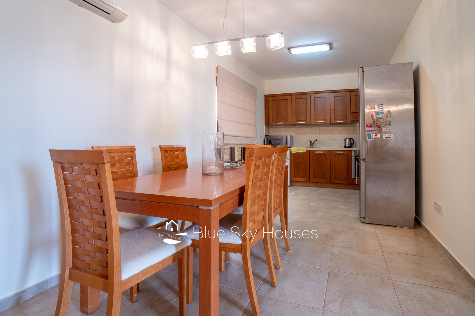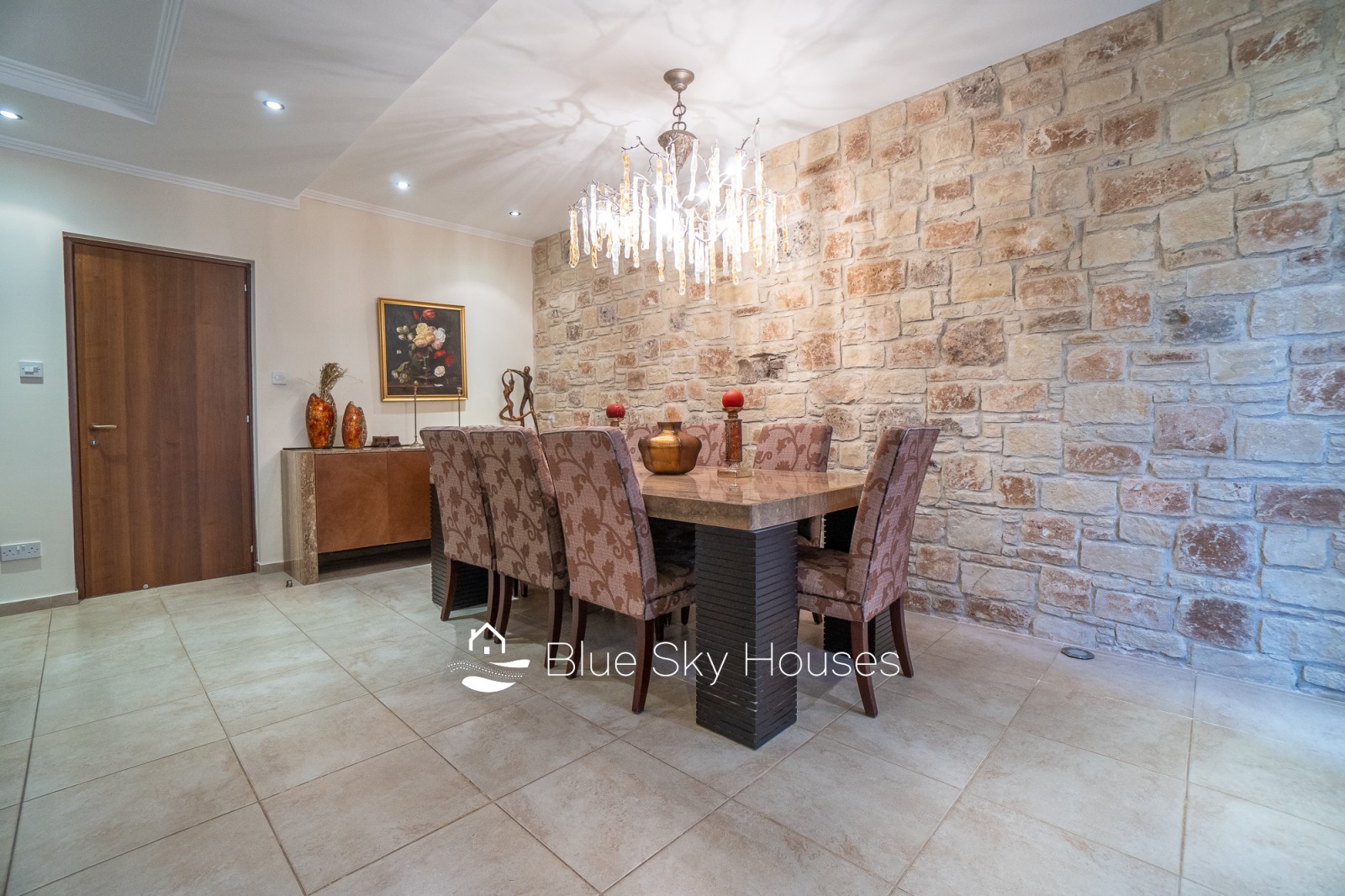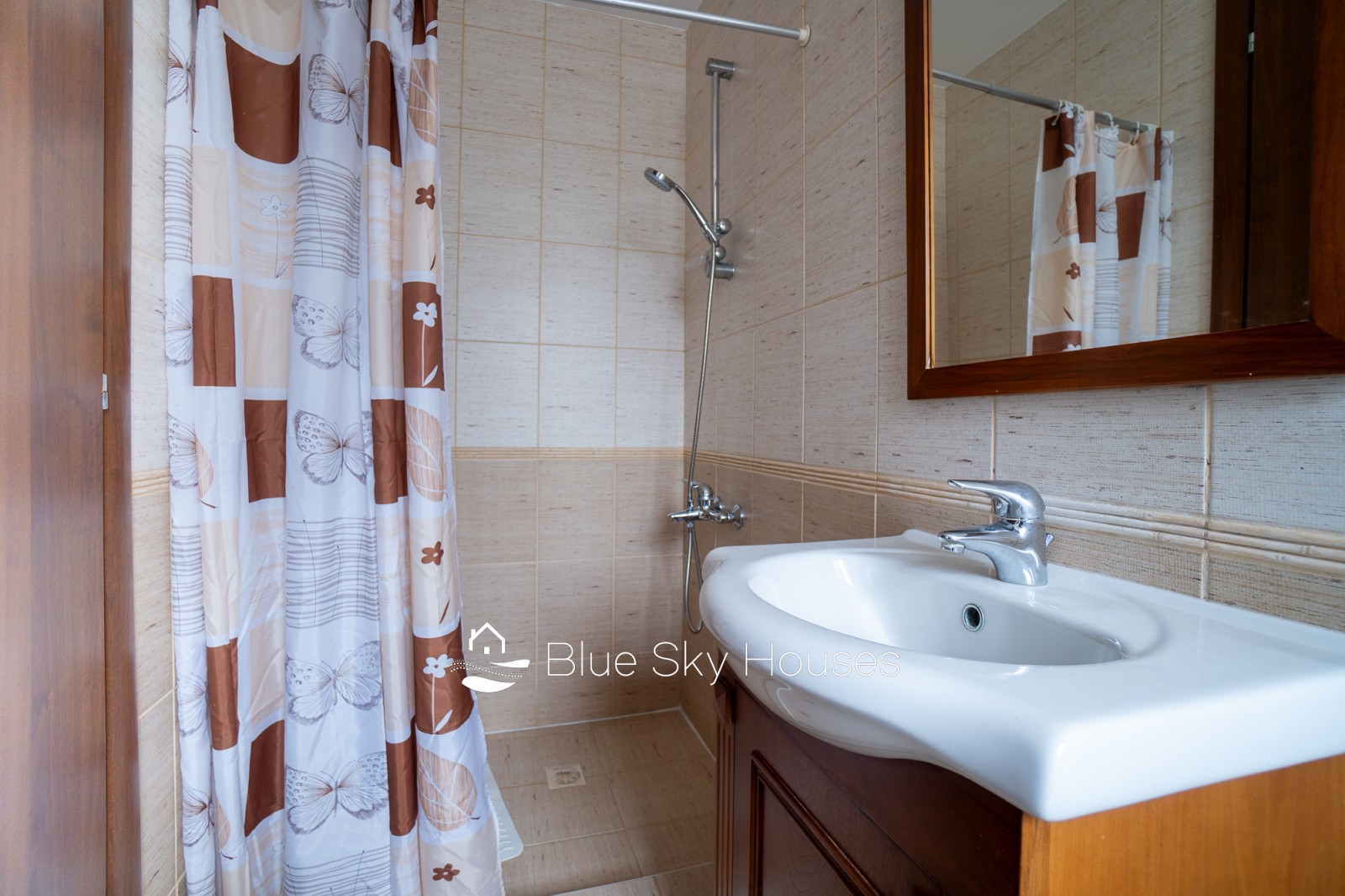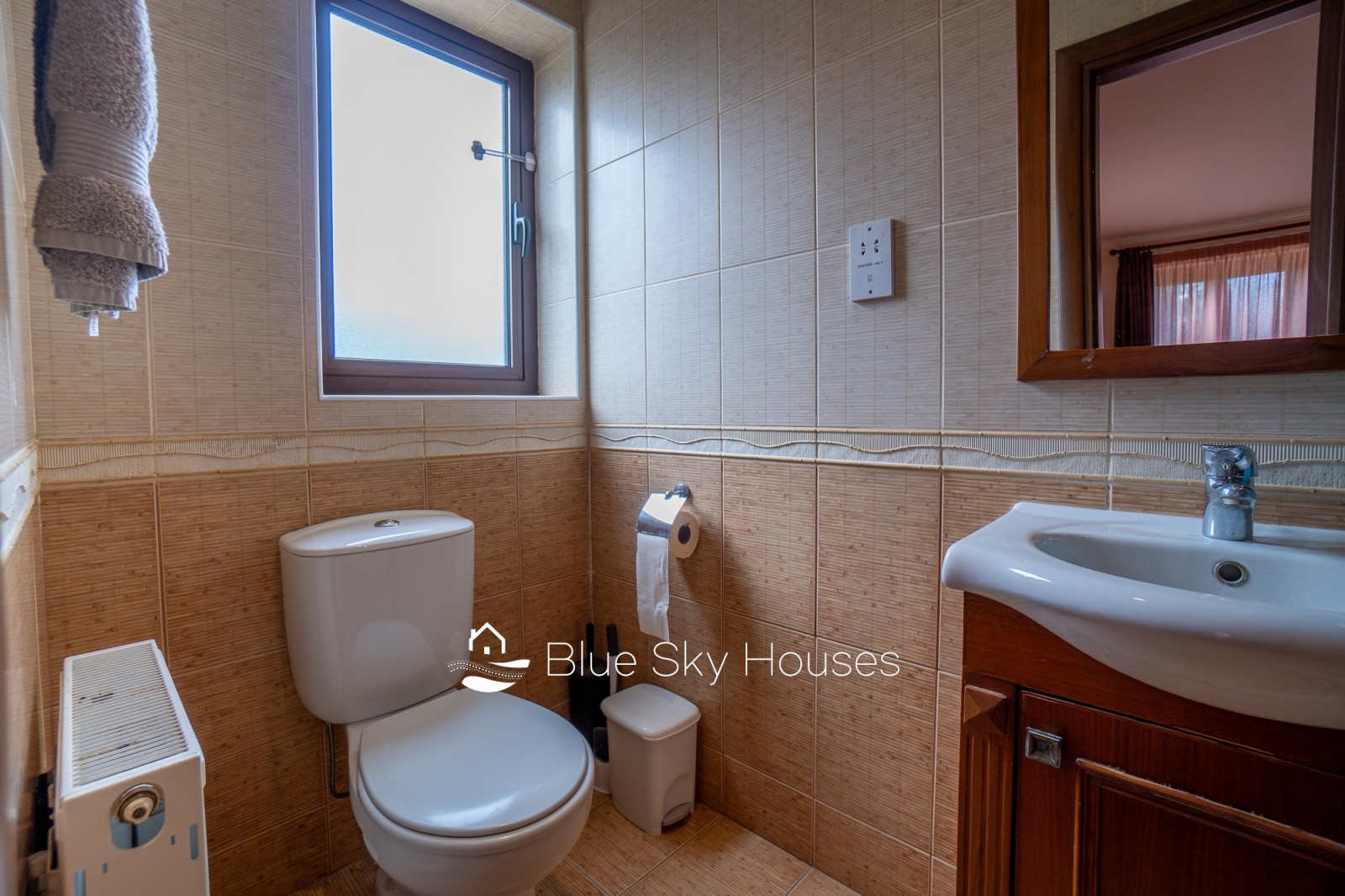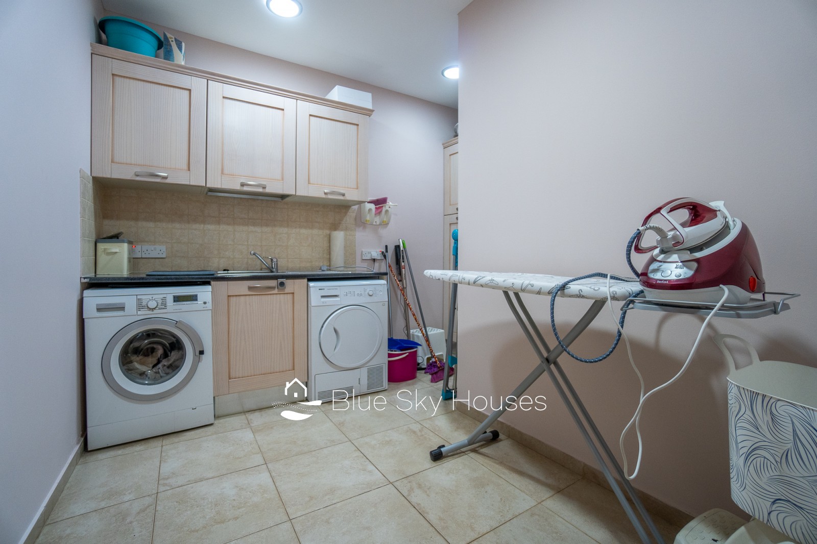 The house offers a generous covered area of 330sqm and is fully furnished. On the ground floor at pool level, there is a spacious living room with a dining area, a separate kitchen, laundry room, guest WC, a large bedroom with an ensuite bathroom and a storage room. A wide and elegant staircase leads to the first floor, where there is a very large master bedroom with an ensuite bathroom featuring both a separate shower and a bathtub. This level also includes an office room and two additional spacious bedrooms, both with ensuite bathrooms.