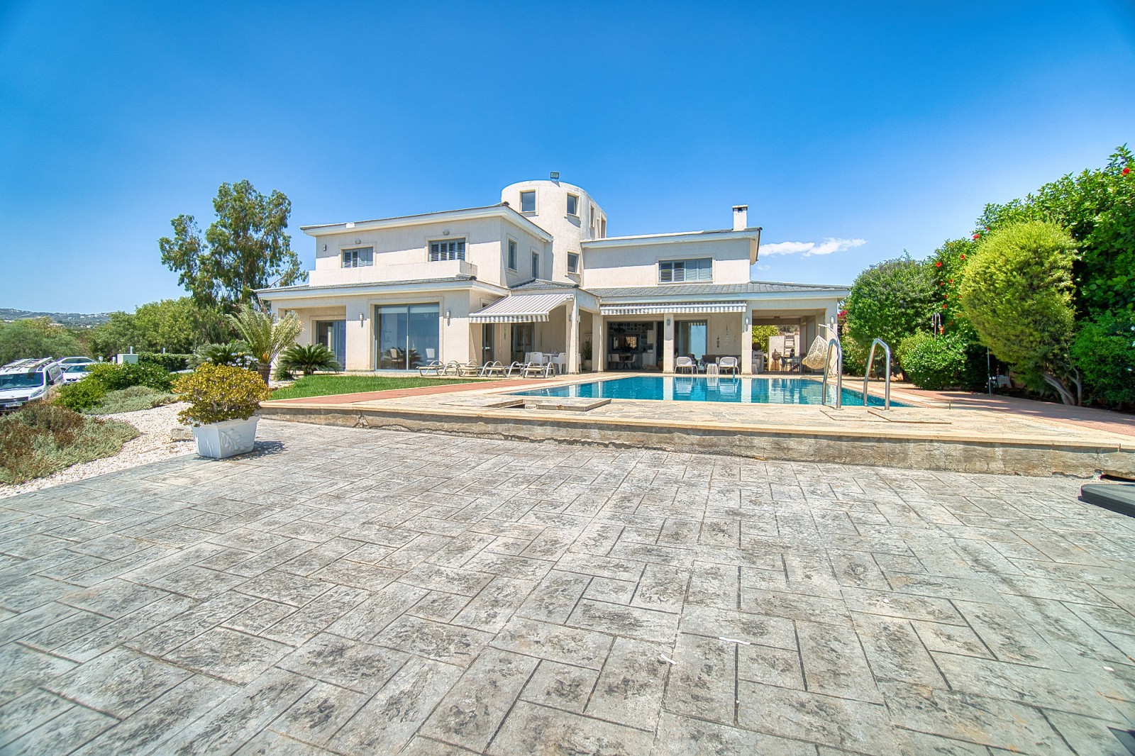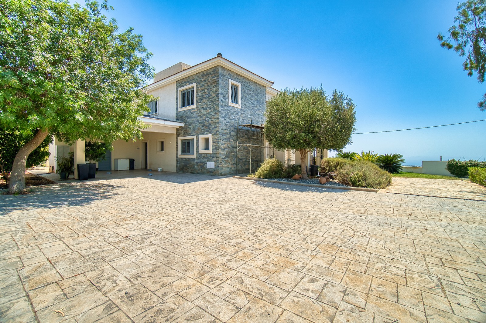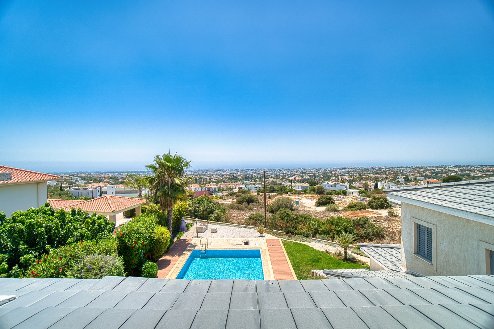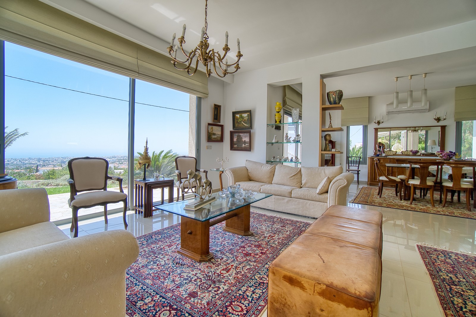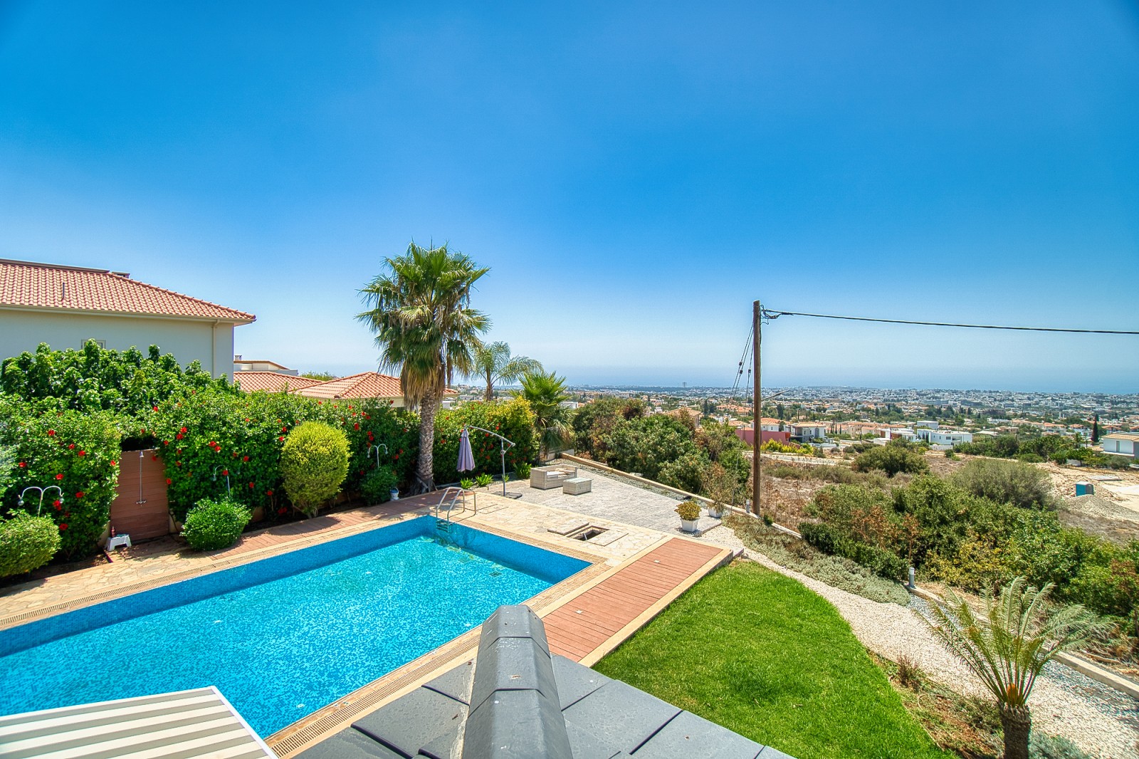 This moderns and luxurious villa is located at an attractive area in Konia,with panoramic views over Paphos city and the sea. The villa is within minutes’ drive to the center of the town and the beach, yet in peaceful surroundings of a village in cul-de-sac, has everything one would need for a stylish lifestyle. Every detail was carefully selected and quality crafted. Highlights include double external walls and double glazing doors sliding into the walls. The expansive living room opens up to a spacious front covered patio with pool and grass area.