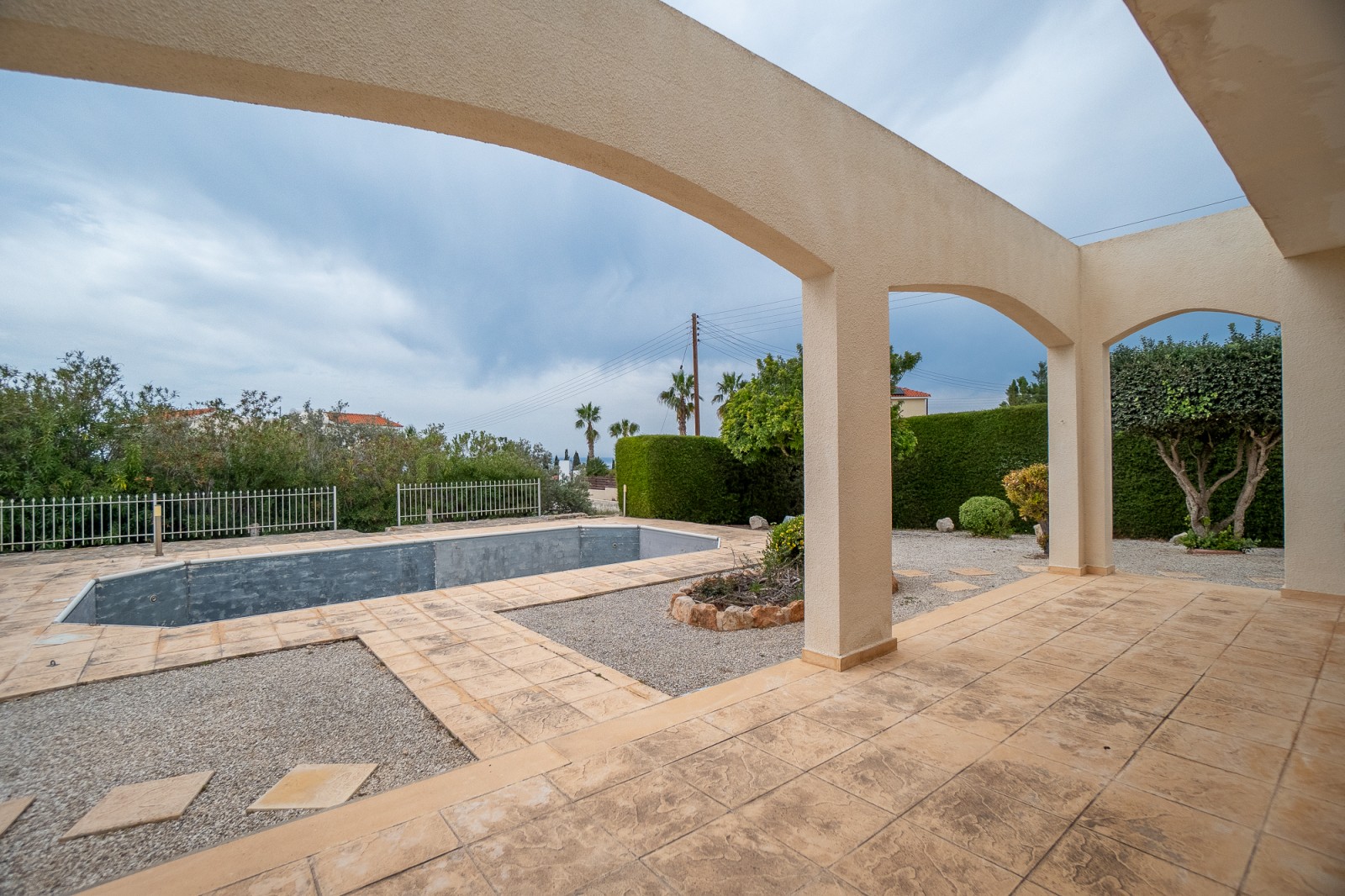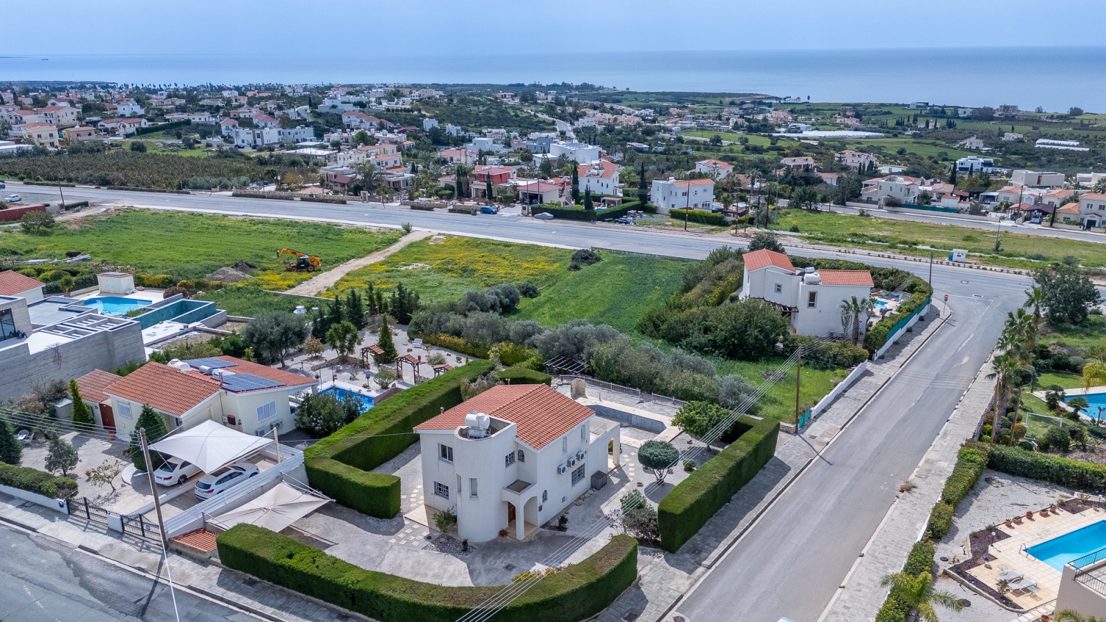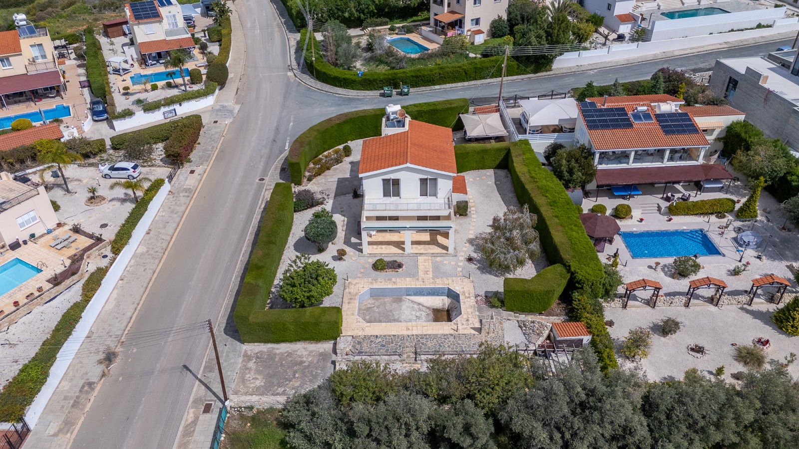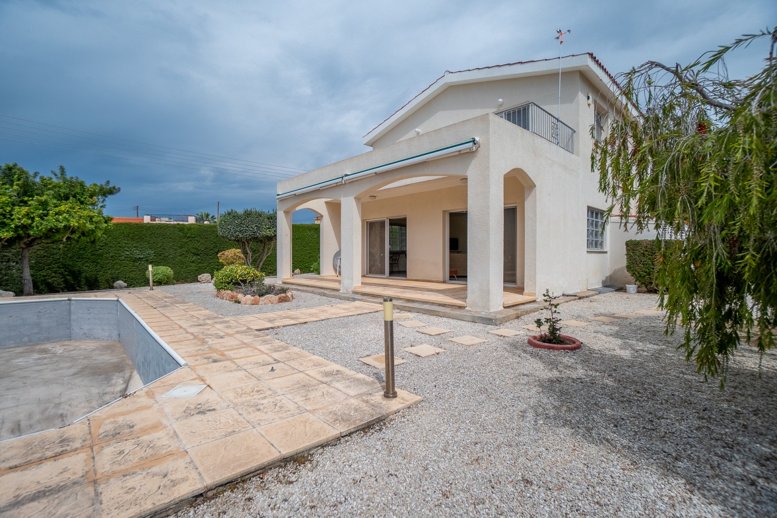This 3 bedroom detached villa is set on a large plot with ample uncovered and covered parking space for multiple vehicles and a large garden. Ground floor: entrance hall, spacious open plan lounge/dining area with patio doors to the garden & pool area, a separate kitchen with granite worktops, and a guest toilet. First floor: master bedroom with en-suite bathroom & balcony with excellent sea view , a further 2 double bedrooms and a shared bathroom. Externally: large graveled garden with mature high level trees affording superb privacy, shrubs & trees Private swimming pool, 3 storage rooms and covered parking.