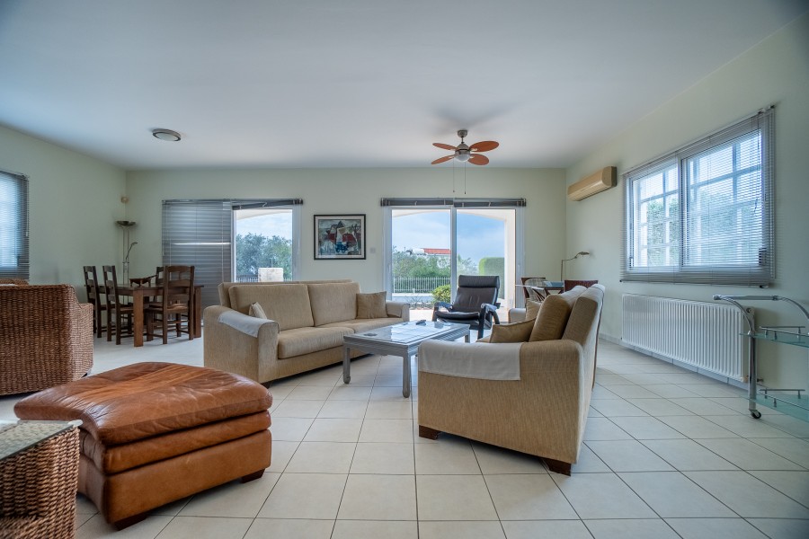 This 3 bedroom detached villa is set on a large plot with ample uncovered and covered parking space for multiple vehicles and a large garden. Ground floor: entrance hall, spacious open plan lounge/dining area with patio doors to the garden & pool area, a separate kitchen with granite worktops, and a guest toilet. First floor: master bedroom with en-suite bathroom & balcony with excellent sea view , a further 2 double bedrooms and a shared bathroom. Externally: large graveled garden with mature high level trees affording superb privacy, shrubs & trees Private swimming pool, 3 storage rooms and covered parking.