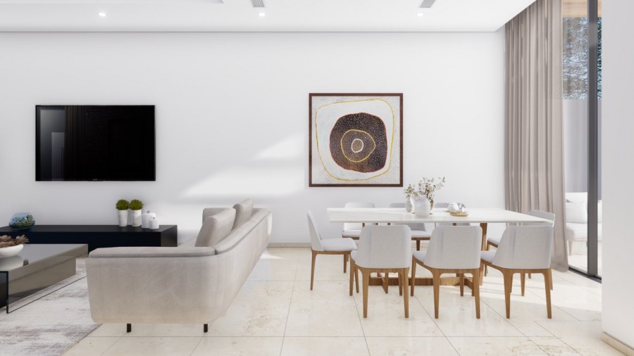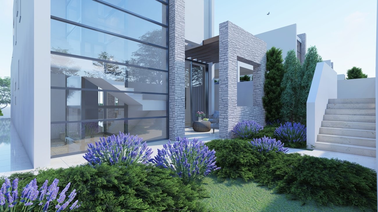 Nesting on a hillside in the St. George area, the project is set in a spectacular panoramic location offering breathtaking sea views of one of the most beautiful and unspoiled areas of the island. This luxury project consists of 9 two-story independent villas with 3 bedrooms and a private pool each, located within a convenient 5-mins walking distance from the nearest beach. Throughout, the view enhances those stunning villas, but it is the interior bespoke design that reflects the ambience of those views. The concept of the floor plan design capitalizes on the astounding sea views, and its modern aesthetic honors the natural surrounding elements with the use of generous glazing that allows natural sunlight into the home. The interior of each villa is organized into two levels. On the ground floor, there is the main living area with large floor-to-ceiling windows, a well-equipped open space kitchen, and a welcoming dining area. The three bedrooms with en suite bathrooms are spread on the ground and first floors. The en-suite dressing room and walking closet add a touch of luxury and serve the modern needs for functionality and comfort. To make this project even more impressive, the exterior areas are dominated by the imposing spacious pool surrounded by sunbeds and sitting and dining areas that offer the feeling of enjoyment and relaxation throughout the day and the night.