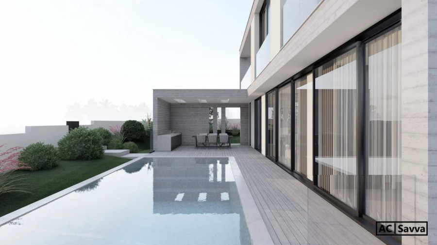 Designed with both comfort and privacy in mind, the villa features expansive living spaces and a seamless indoor-outdoor flow. The ground floor hosts a beautifully proportioned open-plan living and dining area, complemented by a guest toilet and a discreet storeroom. One spacious en-suite bedroom is also conveniently located on this level, ideal for guests or single-level living. Large openings lead directly to the outdoor lounge, BBQ, and pool area—perfect for entertaining or relaxing in tranquil surroundings. A generous garage provides secure parking for two vehicles. Outdoor living reaches new heights with a stylish lounge and BBQ area and the private swimming pool, creating an idyllic setting for both leisure and social gatherings. The first floor is dedicated to relaxation, offering three luxurious bedrooms, each with its own en-suite bathroom, designed as private retreats with comfort and elegance in mind. The basement level adds further versatility, with the option to configure one or two additional bedrooms depending on the buyer’s needs—ideal for extended family, guests, or extra functional space. Built to the highest standards, the villa showcases very high-quality materials and finishes throughout. It is equipped with a VRV climate control system in all rooms, underfloor heating, and a 10 kW photovoltaic system for energy efficiency. Additional features include an intercom system, security cameras, and advanced home comforts that enhance both convenience and peace of mind. With a total covered area of 300 sq.m. including the basement, and an estimated delivery time of 7–8 months, this remarkable villa embodies understated luxury in a peaceful setting—presenting a rare opportunity to own a prestigious sea-view residence crafted for an exceptional lifestyle.
