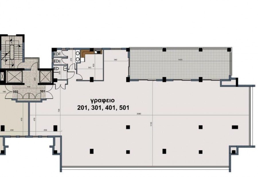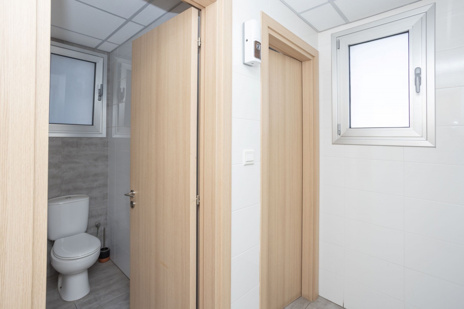 The office is designed for flexibility, featuring an open-plan layout, a separate conference room, and three additional private rooms that can be adapted to suit the needs of the future tenant. A spacious kitchen, 4 WCs, and a shower cabin add to the practicality of the space.